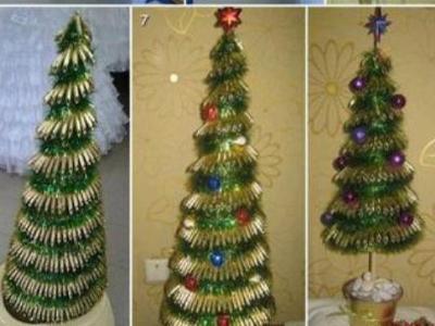 Понадобится: Макароны Краска акварель или аэрозольная (кисточка) Ватман Клей Дождик Елочные украшение С листа ватмана делаем конус, скрепляем. Далее сверху вниз по одной клеим макаронины по спирали. Красим.