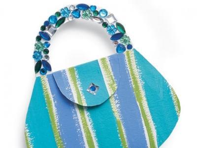Понадобится: Плотная цветная бумага Краски Клей и камушки для украшения Сгибаем 1 /3 часть бумаги Рисуем контур будущей сумочки Вырезаем контур, оставляя язычок сумочки Украшаем ручку сумочки камешками