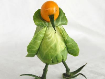 Понадобится: Помидор жёлтый Зубочистка Маленькая капуста Хвостик помидора Загибаем лист капусты, продеваем зубочистку Загибаем два листочка для крыльев Делаем глаза, клюв ножки