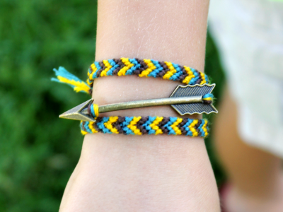Понадобится: Нитки мулине Украшение (здесь стрела) При выполнении этого узора узлы выполняют с двух сторон от краев к середине. Поэтому левая сторона получается симметричной правой и наоборот. Обе