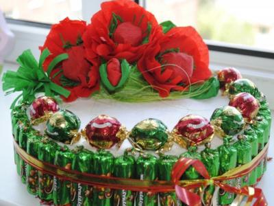 Понадобится: кусок пенопласта или пеноплекса бумага гофрированная необходимых цветов клей ПВА скотч двухсторонний конфеты Вырезаем основу из пенопласта в виде круга. Так как нам нужна ровная и красивая