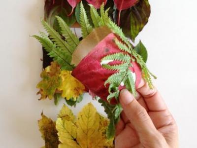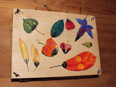 Понадобится: Листя различных форм Краски Собираем несколько листем различной форми. Викладиваем их на «полотно» и при помощи красок создаем различных букашек. Даем подсохнуть