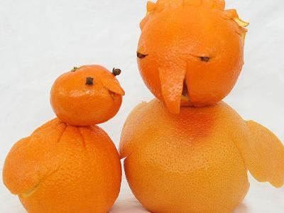 Понадобится: Мандарин, апельсин Берем апельсин, вырезаем из шкурки клюв Из хвостиков делаем глаза Делаем прическу крылья Крепим голову к телу зубочисткой Готово
