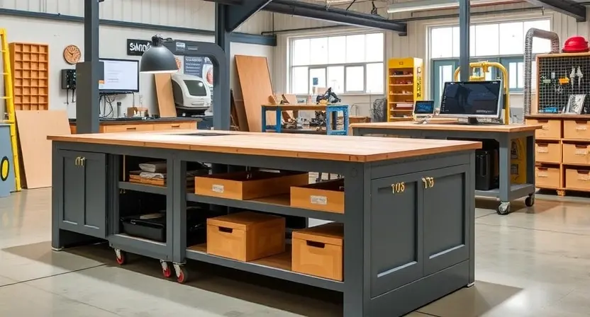 Дополнительное оснащение верстака включает выдвижные ящики для инструментов, полки для материалов, системы освещения и пылеудаления. Правильно подобранные аксессуары значительно повышают эффективность использования рабочего места и создают комфортные условия для персонала.