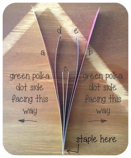 3 Загибаем углы всех подготовленных полос, выкладываем их по очереди, прикрепляем нижнюю часть будущего сердечка степлером, или клеем