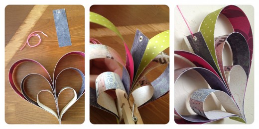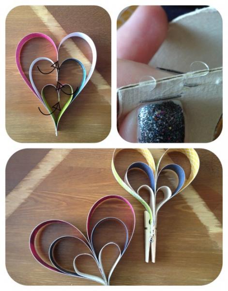 6 если хотите подвесить сердечко сделайте полосу 3″ x 1″, при помощи дырокола сделайте отверстие. Нижнюю часть полоски прикрепите к сердечку клеем и закрепите прищепкой.