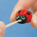 Крепим части вместе (голову к телу, делаем глазки, крепим точки и рожки)