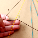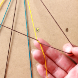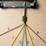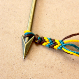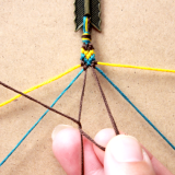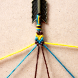 При выполнении этого узора узлы выполняют с двух сторон от краев к середине. Поэтому левая сторона получается симметричной правой и наоборот. Обе стороны выполняются с использованием одинакового числа нитей, составляют половину узора. В середине правая и левая рабочие нити встречаются и соединяются центральным узлом. Так как обе нити имеют одинаковый цвет (как в нашем примере), то не имеет значения, выполнен ли центральный узел левой или правой нитью, направо или налево.