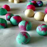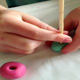 После этого тесто необходимо хорошенько вымесить, чтобы избежать крошения и добиться его эластичности. Разделяем тесто на части, домешиваем краски, делаем кружочки.