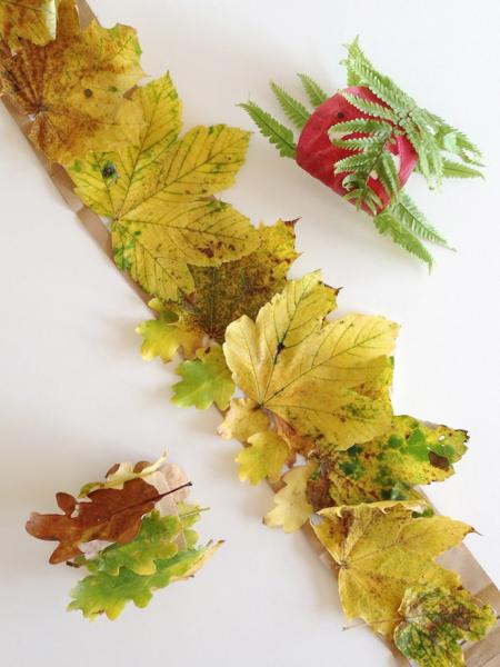 Для начала берем бумажный мешок и нарезаем из него полоски нужной ширины. При помощи клея в желаемом порядке клеем листья. Даем подсохнуть. И склеиваем нужной длинны.