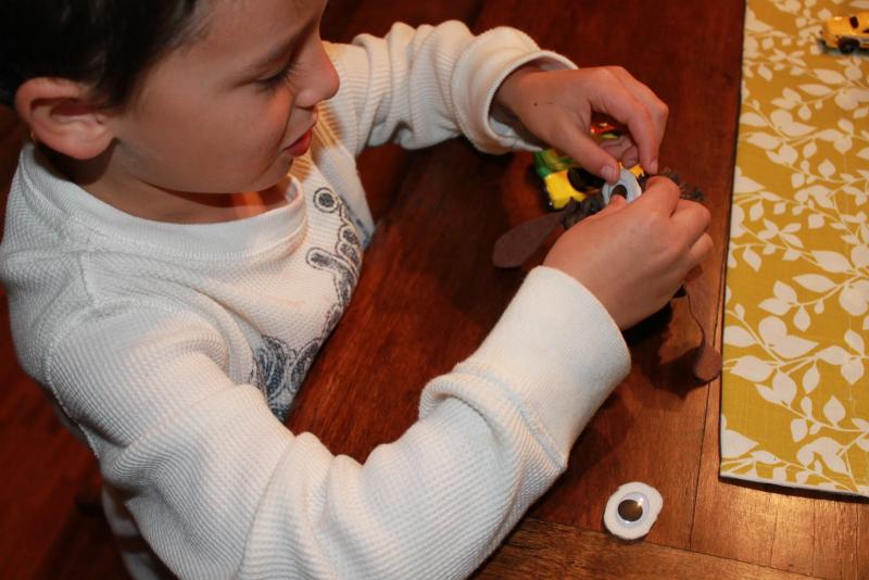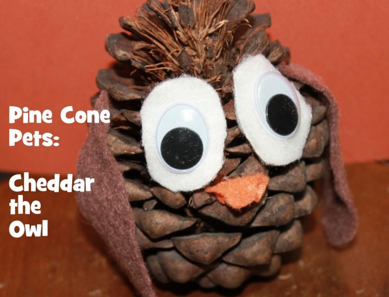 Берем шишку и клеем на нее за ранее вырезанный желтый клюв, и глаза. Даем высохнуть