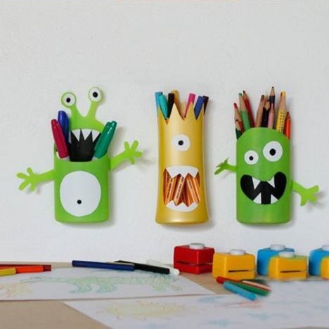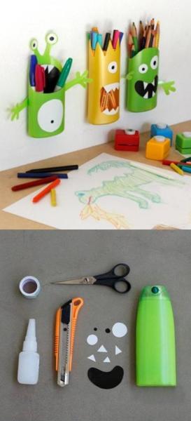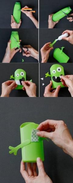 Берем бутылку с под шампуня : прорисовываем контур будущего монстрика. Вырезаем тело, руки. Руки крепим клеем к задней стенке. Вырезаем «лицо» и приклеиваем его. Остается только приклеить двухсторонний скотч и прикрепить на желаемую поверхность. Органайзер Монстрик для карандашей готов.