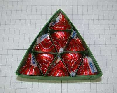 Вырезаем еще одну полоску картона и делаем ствол елки. Для этого берем 1-2 конфеты квадратной или прямоугольной формы.