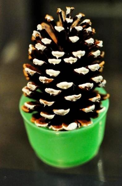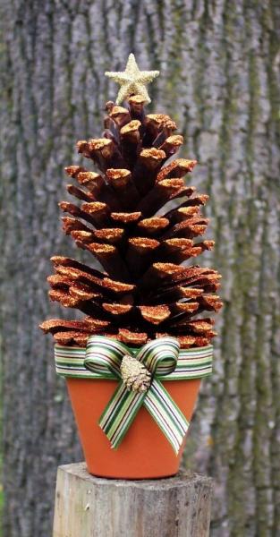 Берем шишку клеим в горшочек, кончики иголок покрываем клеем и посыпаем блестками.
