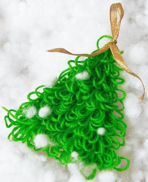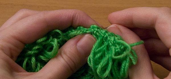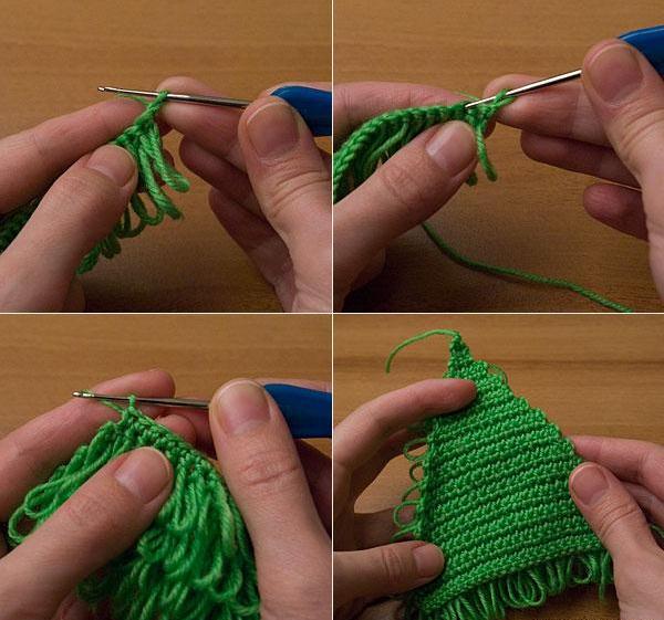 когда набрали нужное количество петель (зависит от размера елки), по чуть-чуть убавляем петли пока не получится форма конуса. Теперь продолжим вязание вытянутыми петлями на связанный ранее конус, а точнее на переднюю петлю основания конуса. Вывязываем их в каждом ряду, накидывая нить на большой палец левой руки пока не доходим до низа.