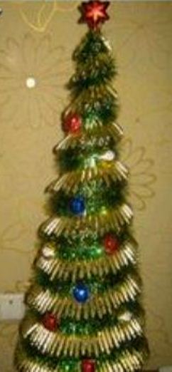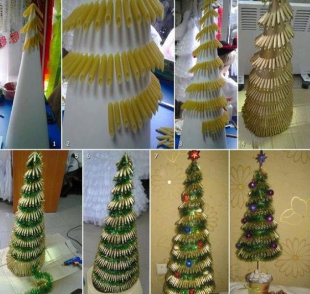 С листа ватмана делаем конус, скрепляем. Далее сверху вниз по одной клеим макаронины по спирали. Красим. Даем высохнуть. Украшаем.