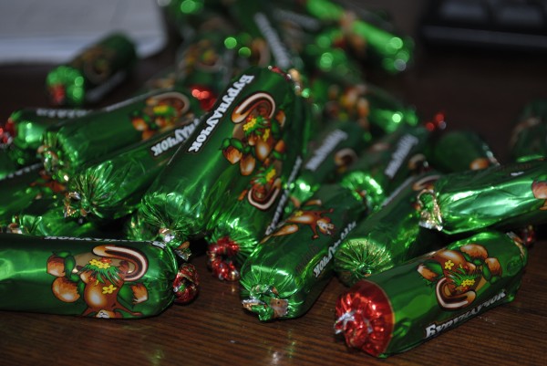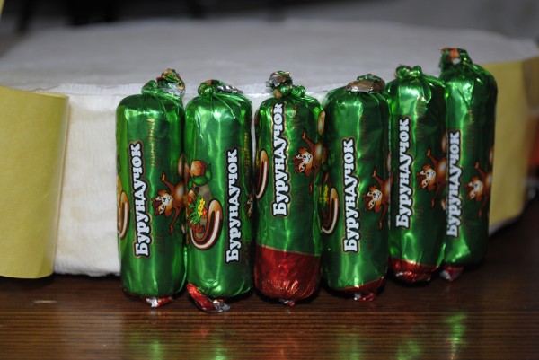 После этого подготавливаем наши конфеты. Перед тем как приклеивать их к основе у конфет нужно хорошо закрутить кончики обертки так, что бы их не было видно.