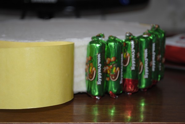 Когда все хвостики спрятаны скручены, берем основу торта и двусторонний скотч. Оклеиваем скотчем боковую часть круга-основы для торта. Теперь самое интересное — нужно приклеить конфеты.