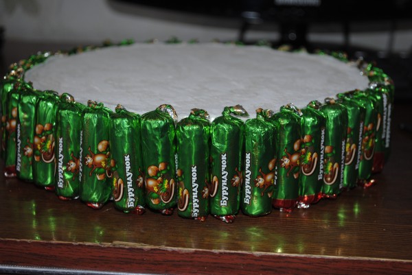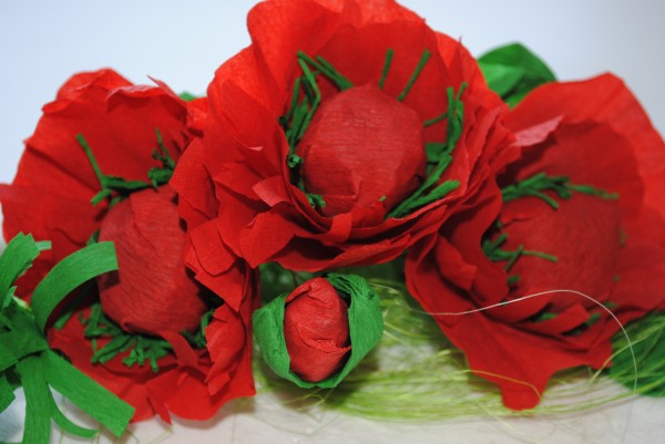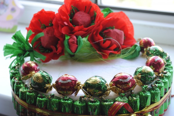 Итак, сам торт из конфет готов, теперь украшаем его. Так как у меня конфеты были в зеленых обертках с красной надписью, то я решила и цветы сделать красными с зеленью.