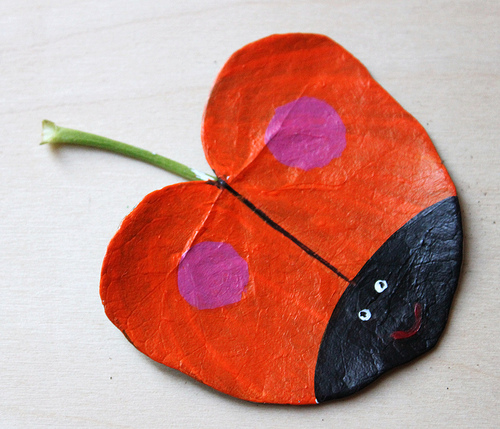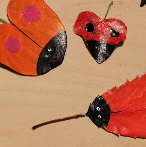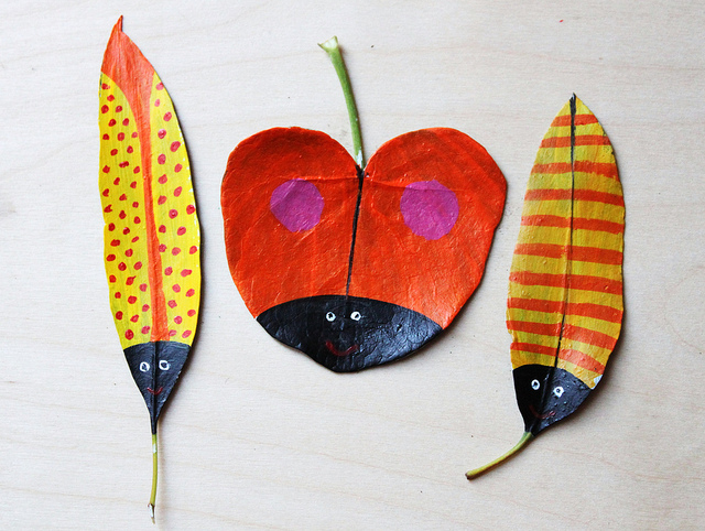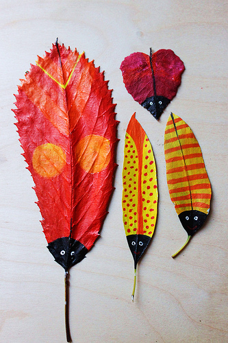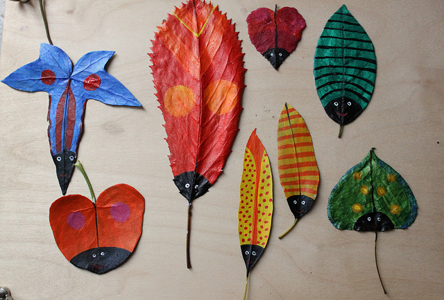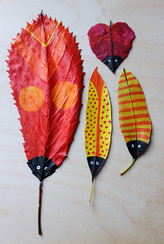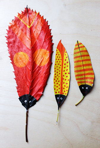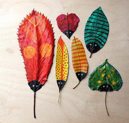 Собираем несколько листем различной форми. Викладиваем их на «полотно» и при помощи красок создаем различных букашек. Даем подсохнуть