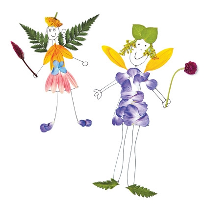 Рисуем нашу фею, по желанию разукрашиваем ее. Когда фея нарисована при помощи лепестков и листочков украшаем фею. Тонким слоем клеем на нее украшения и даем им высохнуть.