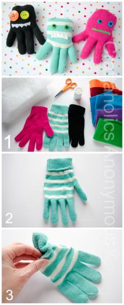 Монстрики из перчаток Понадобится: Несколько пар перчаток Ножницы, иглы Накладные глаза, или кусочки ткани для глаз и рта Наполнитель (силикон)