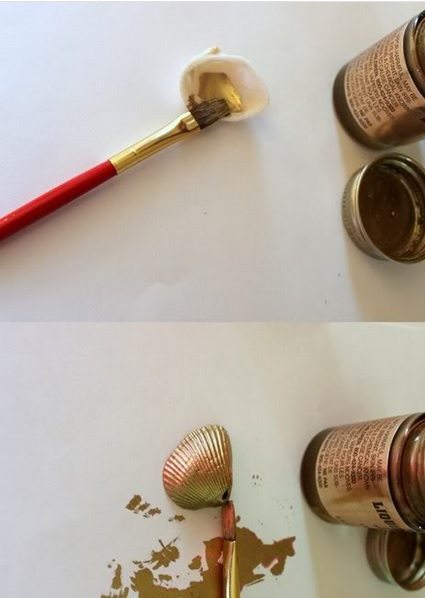 Клеем к ракушке нить при помощи пистолета. Даем подсохнуть. Окрашиваем в нужный цвет.