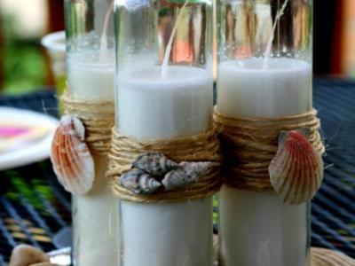 На выбранный подсвечник накручиваем несколько кругов нитки и горячим клеем закрепляем. Поверх нитки при помощи клея крепим ракушки желаемой формы. Даем высохнуть, и свечи готовы!