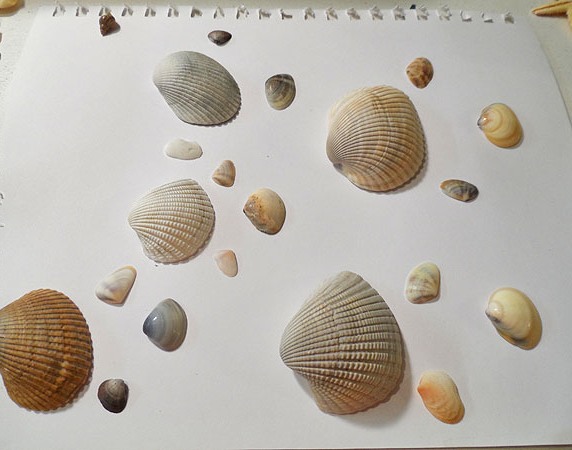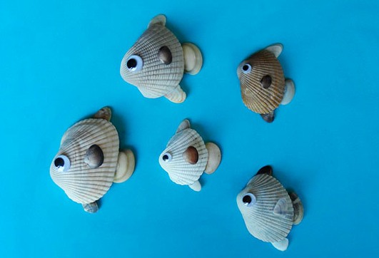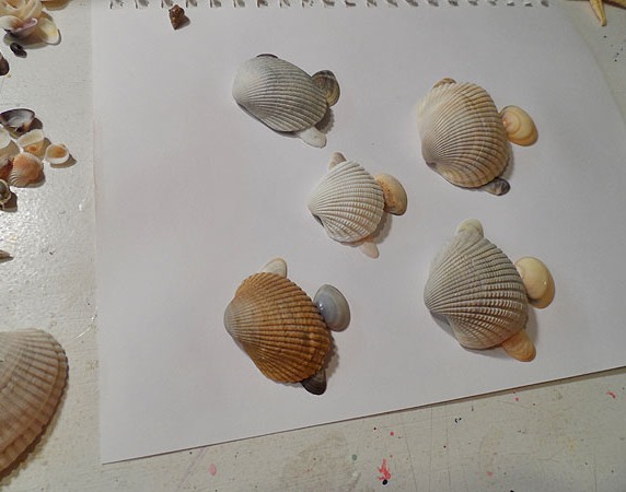 Берем, несколько ракушек выкладываем на лист бумаги. Берем 1 большую ракушку, она послужит телом. Далее делаем тело. Когда, подобрали ракушки нужного размера приклеиваем их по одному. Потом клеем глаза. Даем высохнуть.