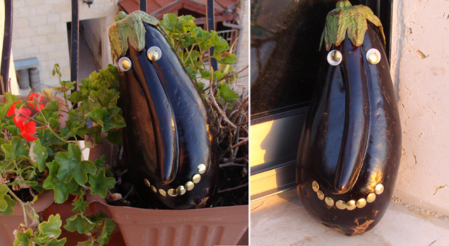 Веселый баклажан Понадобится: Баклажан 2 пуговицы (глаза) Кнопки Берем баклажан и при помощи кнопок делаем улыбку, и глаза