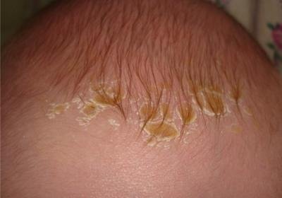 Это явление у новорожденного может наблюдаться массово по всей головке, ее волосистой части. Но чаще всего корки расположены в зоне родничка, имеют тенденцию со временем разрастаться гроздьями. Обычно они белого цвета, порой с оттенком желтизны. Многим молодым родителям они напоминают перхоть. Но ни в коем случае нельзя применять к ним обычные меры борьбы с себореей.